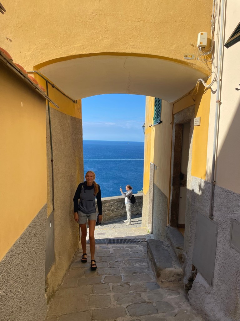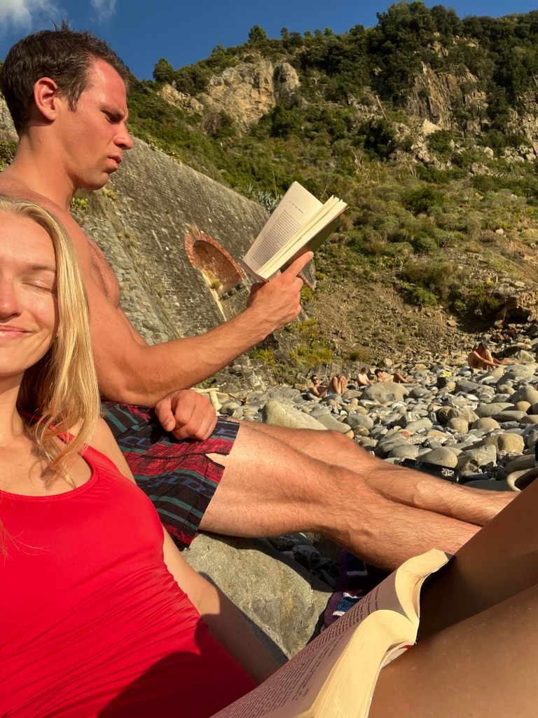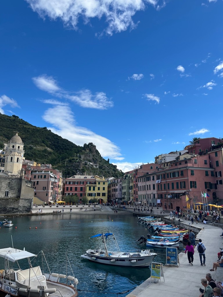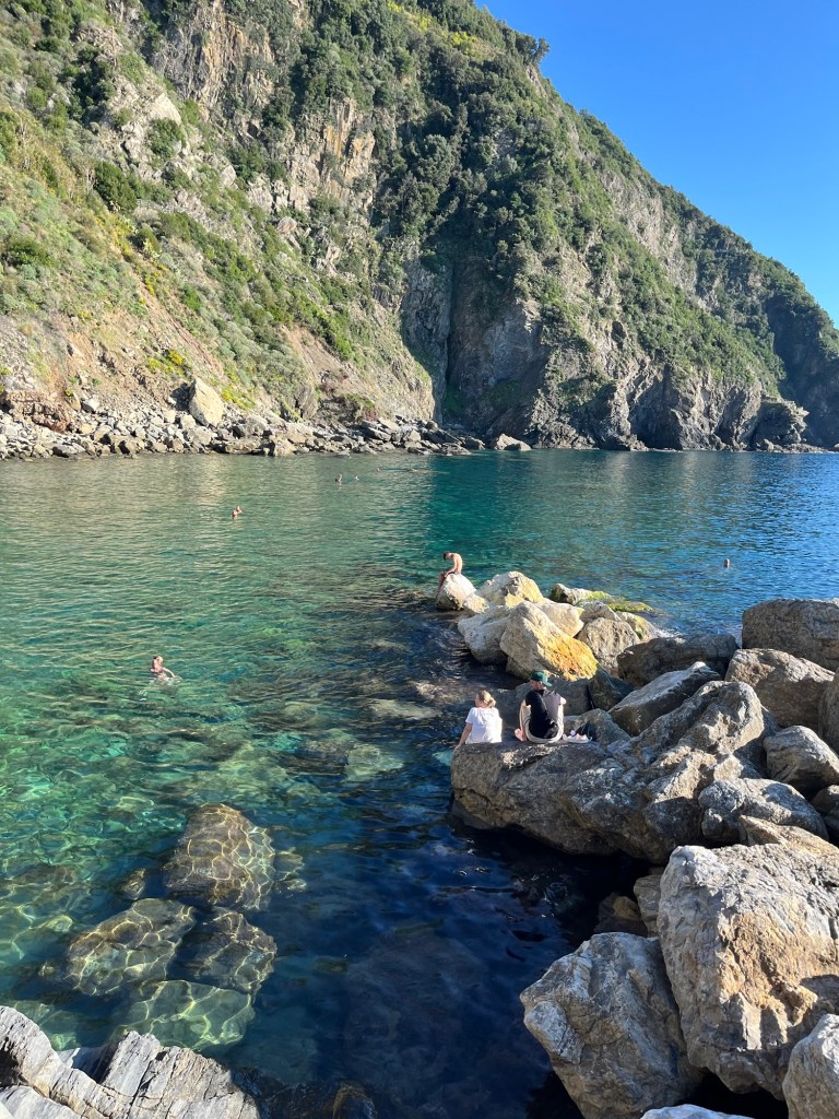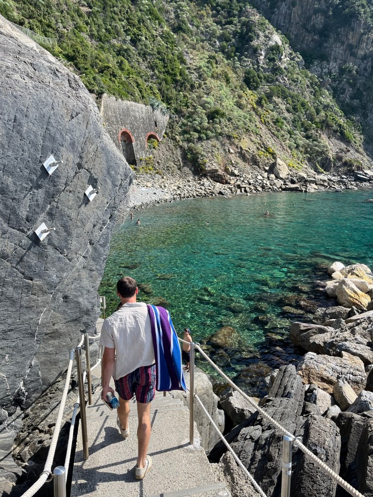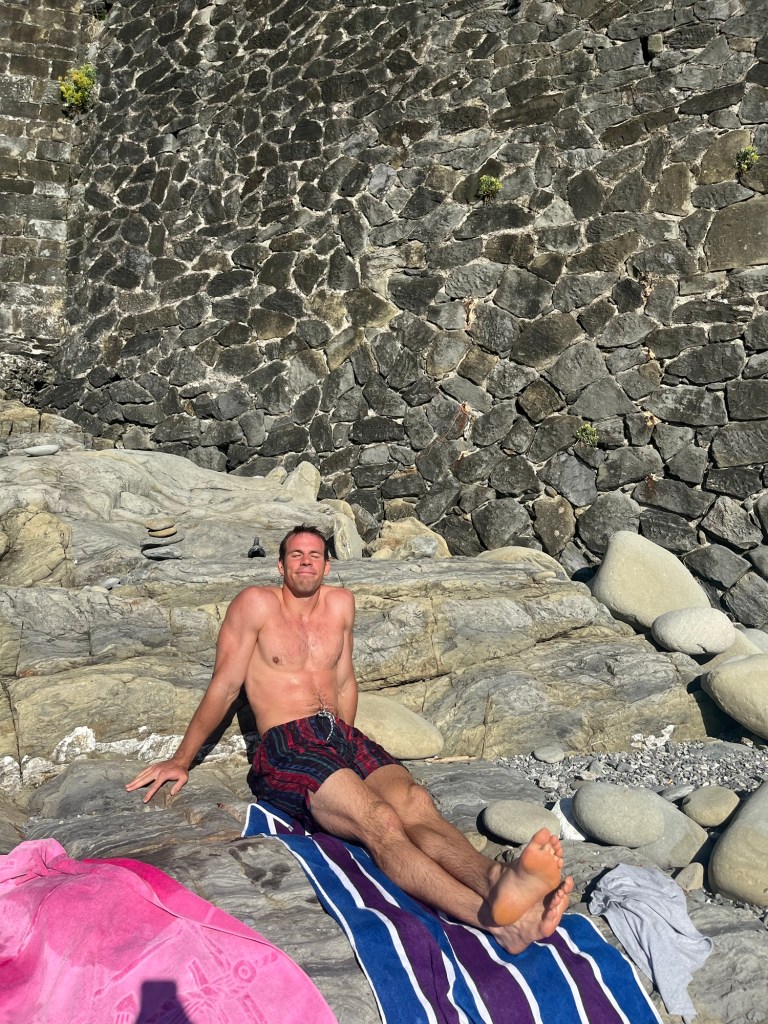 This town was quite a contrast from the others. It wasn’t built up on a cliff, and instead had a long stretch of beach — some pebble, some actual sand. It felt a bit more commercial, but the water was beautiful and easily accessible. We swam, wandered through the streets, and then headed back. After visiting all five, Ben and I both agreed — we were still quite happy with our home base in Riomaggiore.