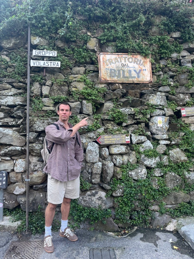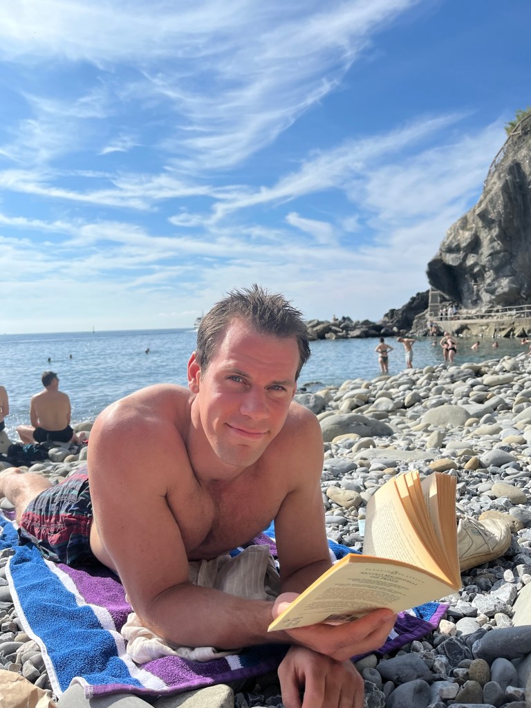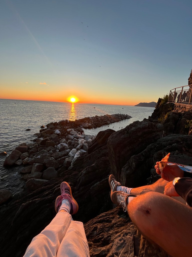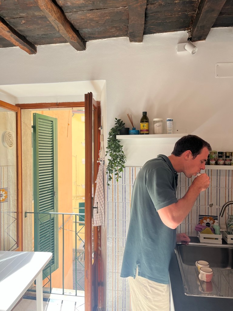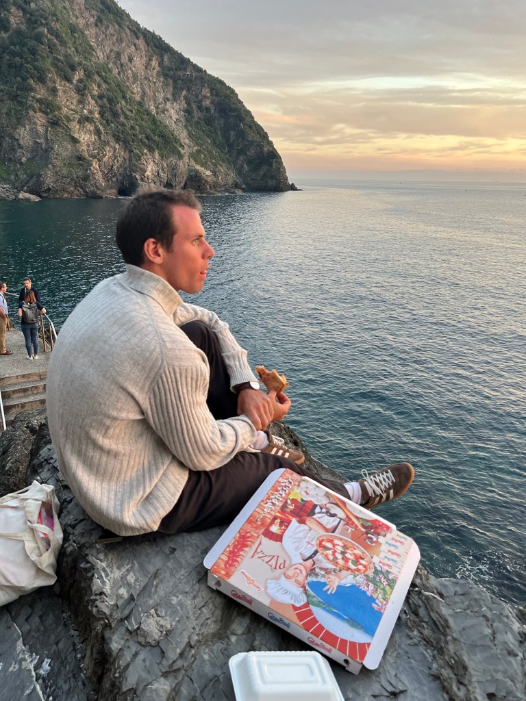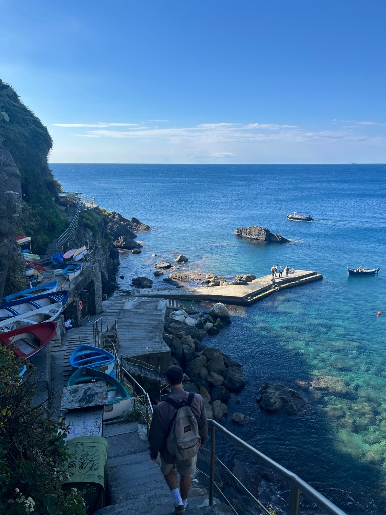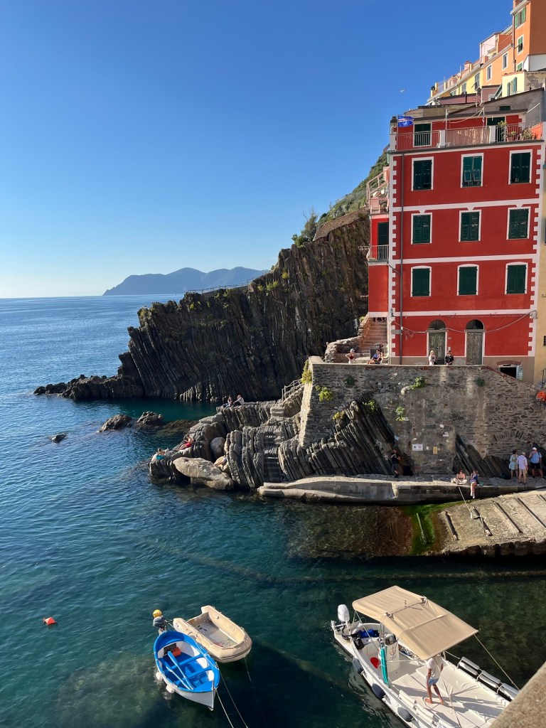 This town was quite a contrast from the others. It wasn’t built up on a cliff, and instead had a long stretch of beach — some pebble, some actual sand. It felt a bit more commercial, but the water was beautiful and easily accessible. We swam, wandered through the streets, and then headed back. After visiting all five, Ben and I both agreed — we were still quite happy with our home base in Riomaggiore.