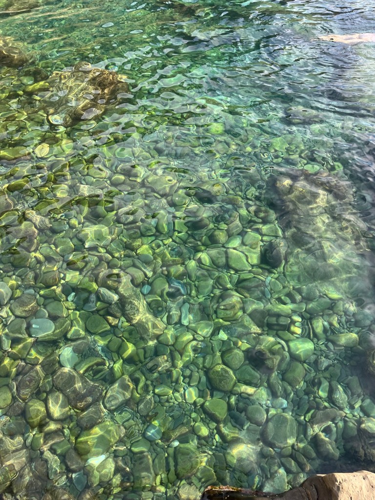 We swam and read, soaking up the sun and listening to the ebb and flow of the water on the rocks. Later on a few small groups wandered into our little paradise, and we decided it was time to move on. Back up the steep stairs and then down we went. I was completely enamored by that perfect cove — she was a beauty.