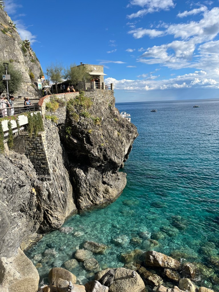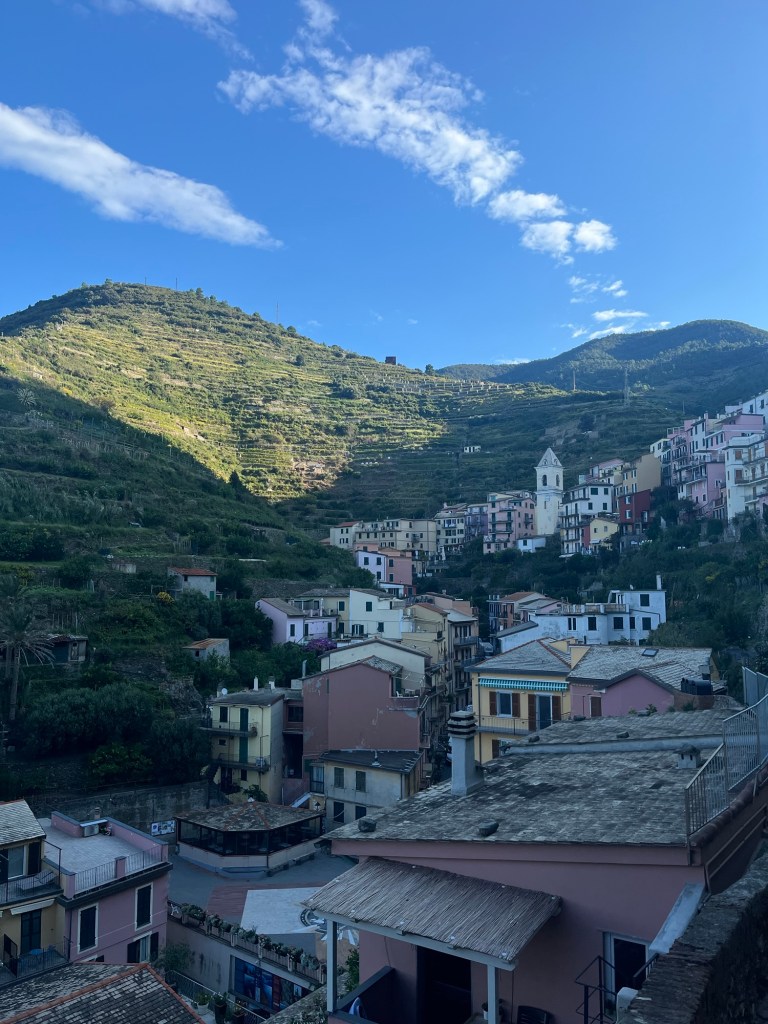 We managed to visit all five towns (the most trains we’ve caught in a single day so far — six in total!). We headed out early in the morning while it was still a bit chilly, and after our cappuccino and chocolate croissant, we caught the train to Manarola.